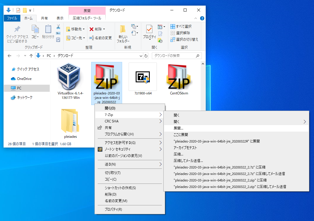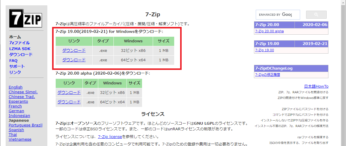 【7-Zip】インストール方法 [7-Zip]をダウンロードしましょう下記のURLをクリックしてください。https://sevenzip.osdn.jp/赤枠の中でPCのビット数に合うものを選んでダウンロードをクリックするとダウンロードされます。 [7-Zip]を使った圧縮ファイルの解凍①解凍したい圧縮フォルダを右クリックします。②[7-Zip]→[展開…]または[ここに展開]を選んでクリックすると解凍できます。 [展開…]は展開先を選べます。これで解凍完了になります。