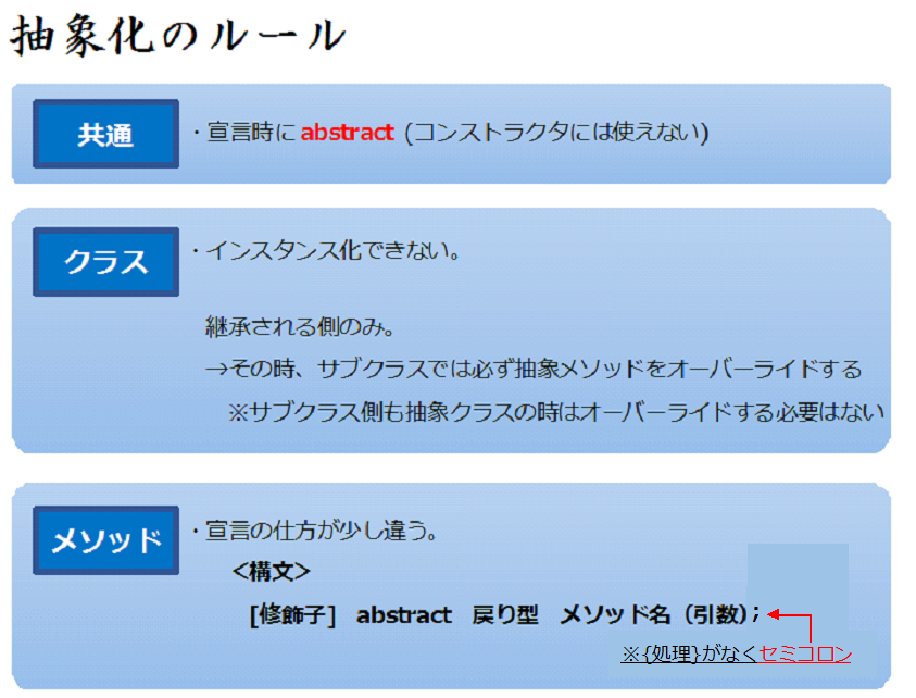 (処理のあるメソッドは具象メソッドと呼ばれる。)