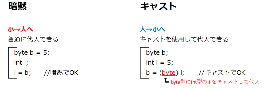 (扱える範囲内であれば)型変換でデータの代入を可能にする。