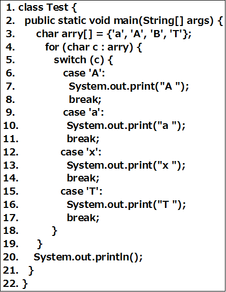 4行目のfor文より配列内の要素を1つずつ取り出し、switch文の式で使用しています。「a」「A」「T」については合致するcaseがあるため出力されますが、「B」は合致するcaseがないため出力されません。