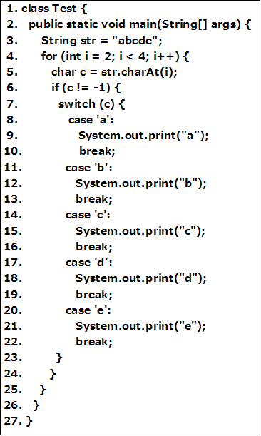 問題文のfor文の条件では、i変数の値が2と3であるときのみ、処理文が実行されます。5行目にある処理文では、変数iの値が2のとき、c変数には「c」が代入され、i変数の値が3のとき、c変数には「d」が代入されます。したがって、正解の実行結果は選択肢Eです。