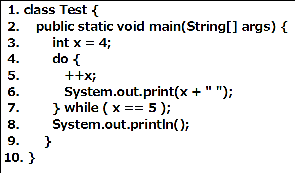 問題文のdo-while文は、x変数が5であれば処理が行われます。したがって、1回目のdoブロックが実行された後、x == 5 でtrueとなり、もう一度doブロックが実行されます。しかし、2回目のx == 5 はfalseとなるため、繰り返し処理が終了します。したがって、正解の実行結果は選択肢Fです。