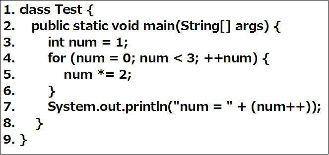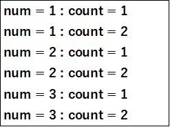 num = 3 : count = 2選択肢Eの実行結果は次のとおりです。