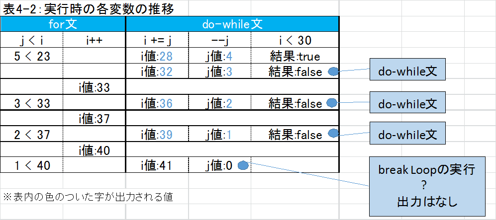 実行時の各変数の推移は表4-2のとおりです。したがって、正解は選択肢Eです。