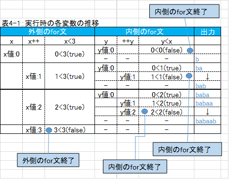 内側のfor文は{ }が省略されています。したがって、内側のfor文の処理文は「a」を出力する5行目のみです。「b」を出力する6行目は外側のfor文の処理文なので、注意しましょう。