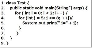 外側のfor文の条件式から、繰り返し処理が2回行われることがわかります。その処理内容は内側のfor文であり、ここでは5から8まで出力します。したがって、正解の実行結果は選択肢Dです。